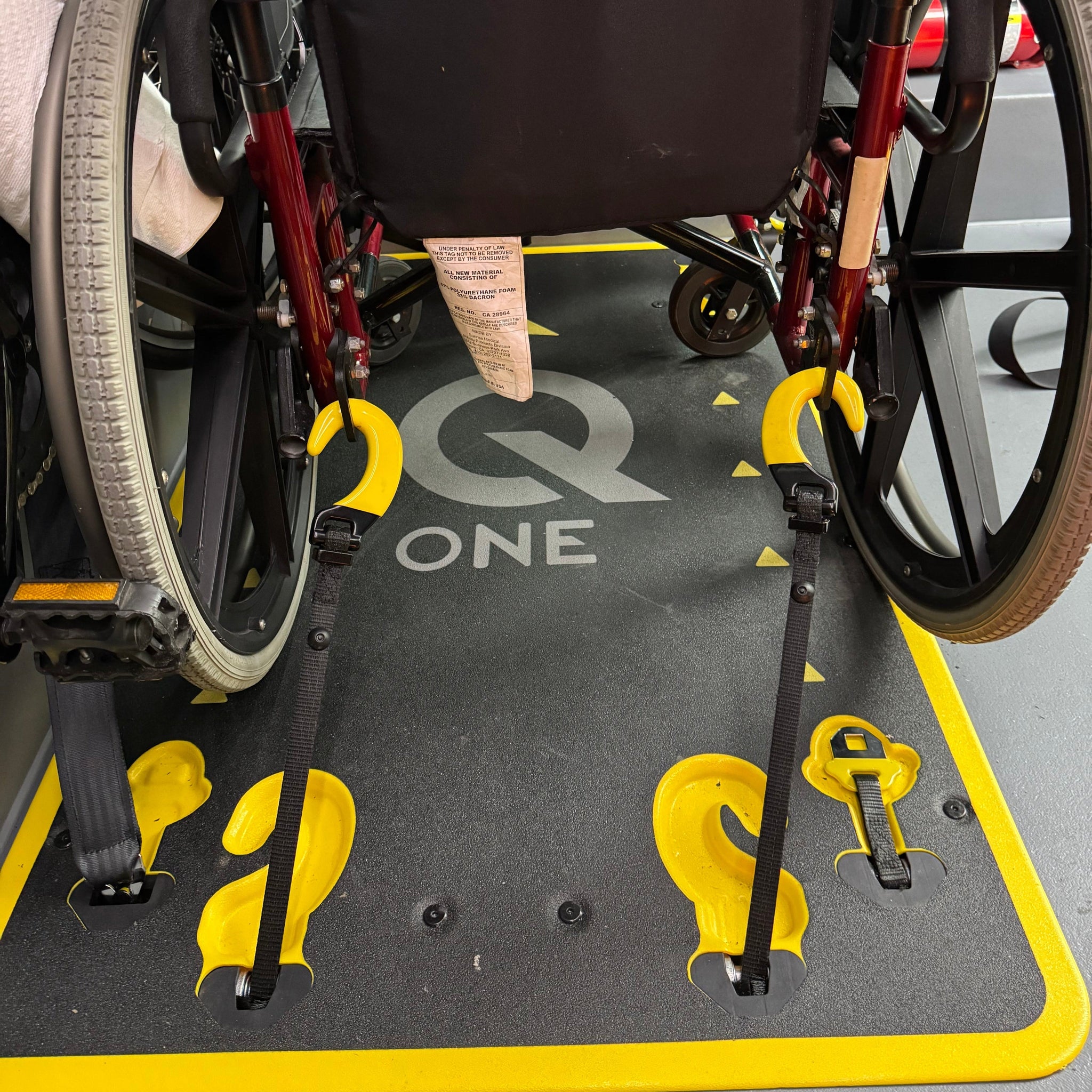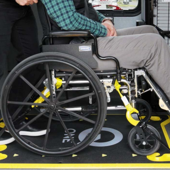 ✔️No more struggling to attach securements to floor anchorages or securement angle guessing games. Operators proceed with confidence every time, even for complicated devices, like scooters and oversized chairs.
